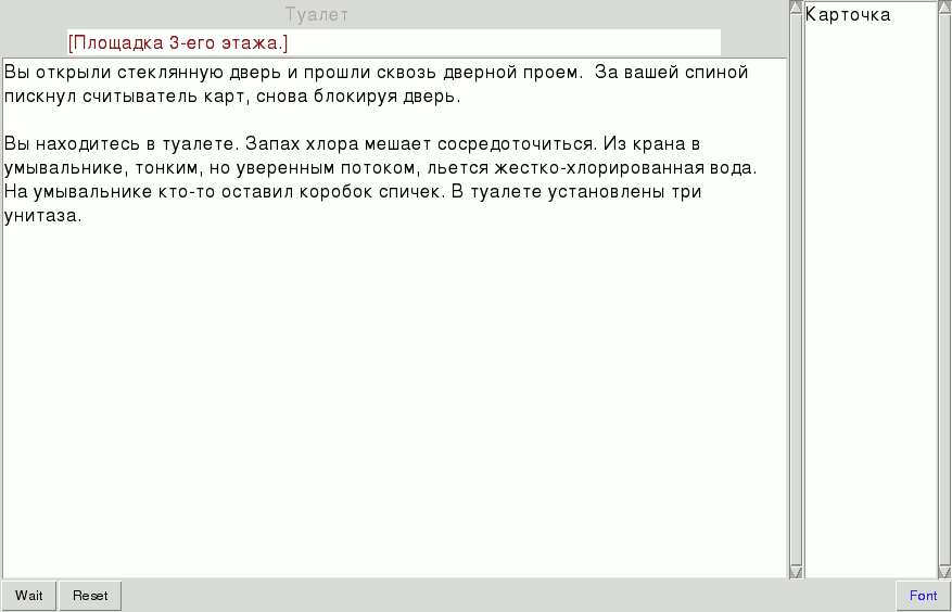 Все это время в моем подсознании зрела мысль, что квест еще не написан, а движок — не идеален… Я прочитал документацию по Lua еще раз и понял что все, что я написал — хлам. К счастью хлама было не много, и я переписал движок с чистого листа, учитывая ошибки и узкие места игры — концепта. На этот раз получилось около полутора тысяч строк на Lua, все еще достаточно просто и гораздо проще (и, надеюсь, достаточно гибко), чем существующие «менюшные» движки. И вот, дописывая движок меня прорвало — я начал писать свой «первый» квест, о хакере дауншифтире и парадоксах квантовой механики. Как и в случае с концептом, движок дорабатывался во время написания игры. В отличие от игры-концепта, я изначально планировал консольное, а не графическое управление игрой. С одной стороны, это добавляло шарма и сближало игру с классическими IF играми, с другой стороны — использование библиотеки readline делало управление игрой довольно комфортной.